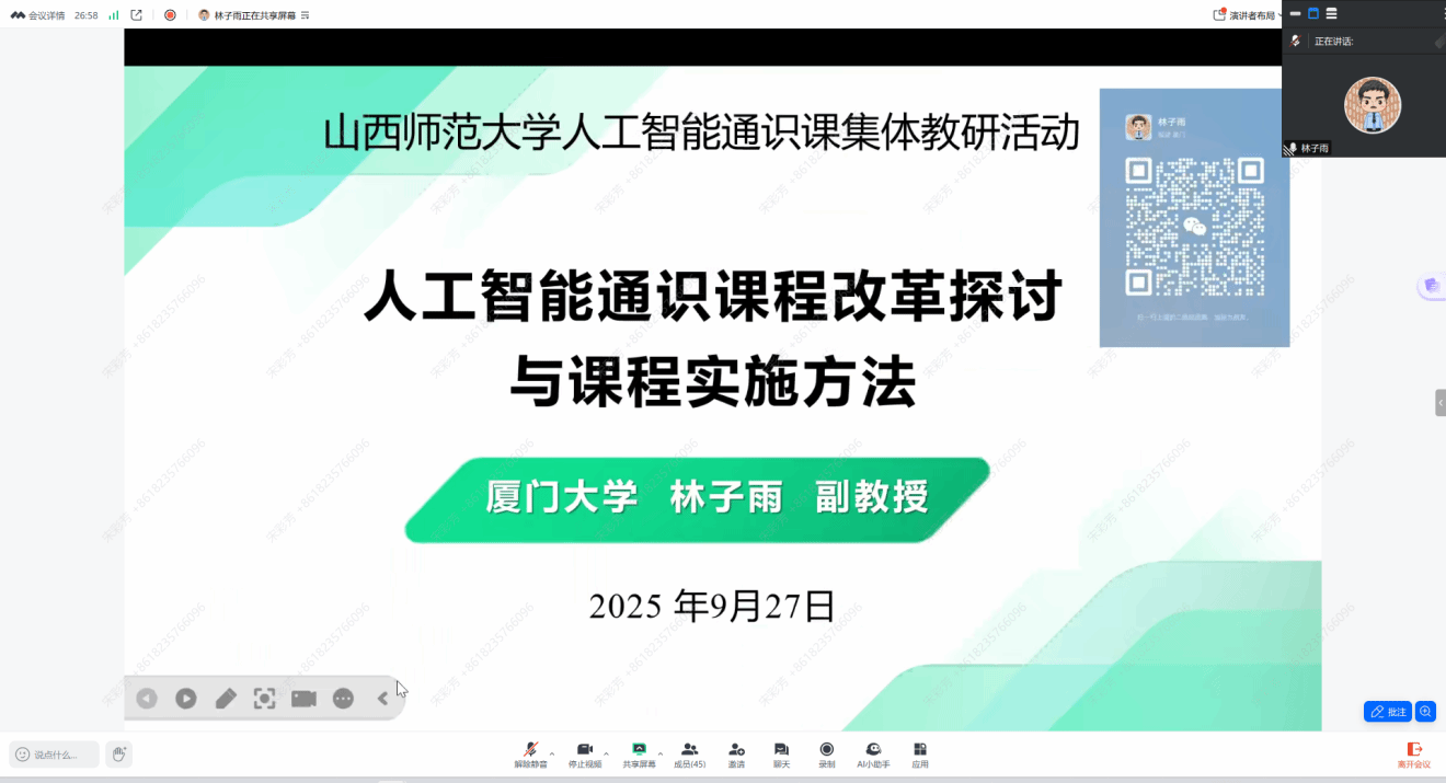 2025年9月27日下午,我院组织召开了《人工智能通识教程》线上教学研讨会议。会议通过腾讯会议线上举行,吸引了来自省内多所高校的教师参与,参会人数达百余人。
