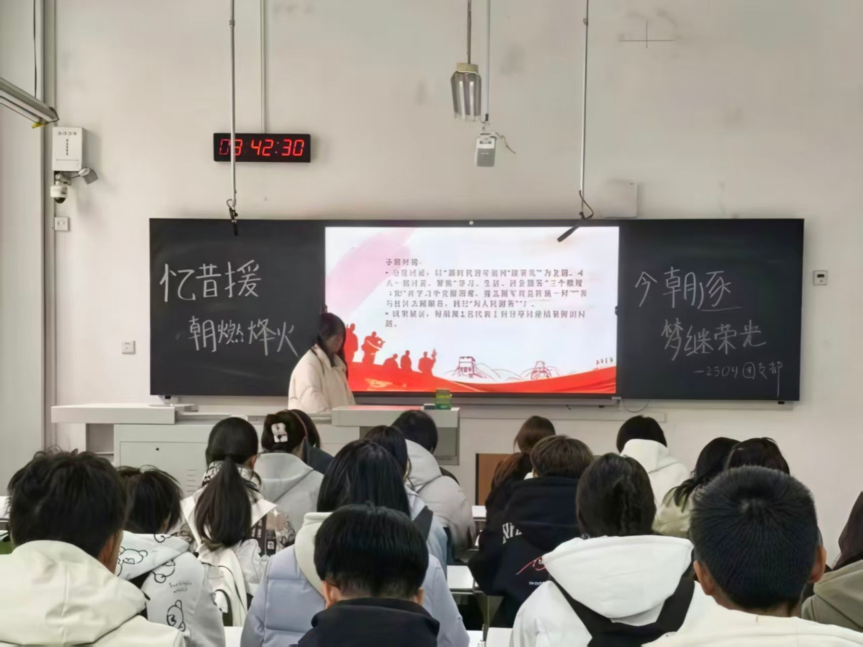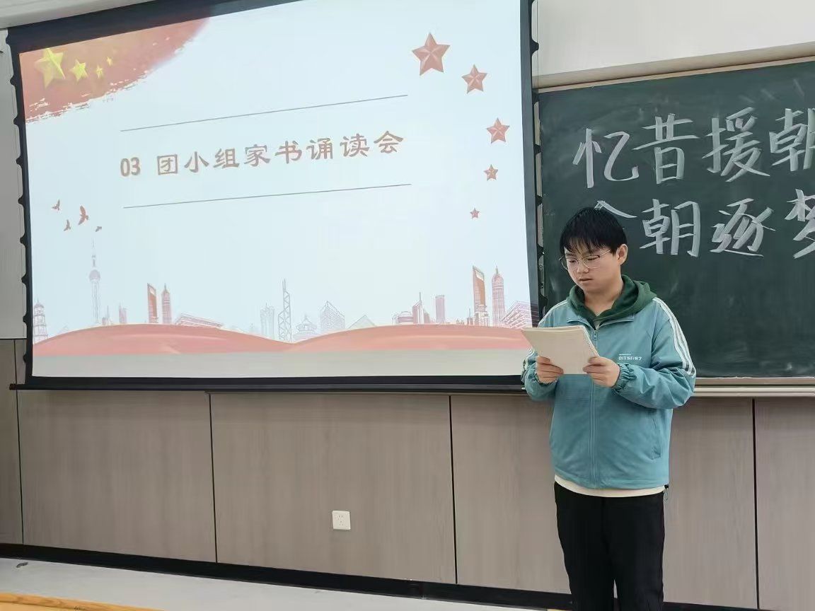活动伊始,各团支部组织同学们集中观看抗美援朝主题纪录片《冰血长津湖》片段,学习《铭记伟大历史,推进伟大事业》文章,在光影与文字的交织中,大家深刻感受到那段艰苦卓绝的岁月,被志愿军将士不畏牺牲、保家卫国的崇高精神深深震撼。随后,各团支部相继开展战地家书诵读,并围绕“新时代青年如何传承抗美援朝精神”进行主题研讨,引导同学们将历史震撼转化为奋进动力,进一步坚定了传承红色基因、担当复兴使命的理想信念