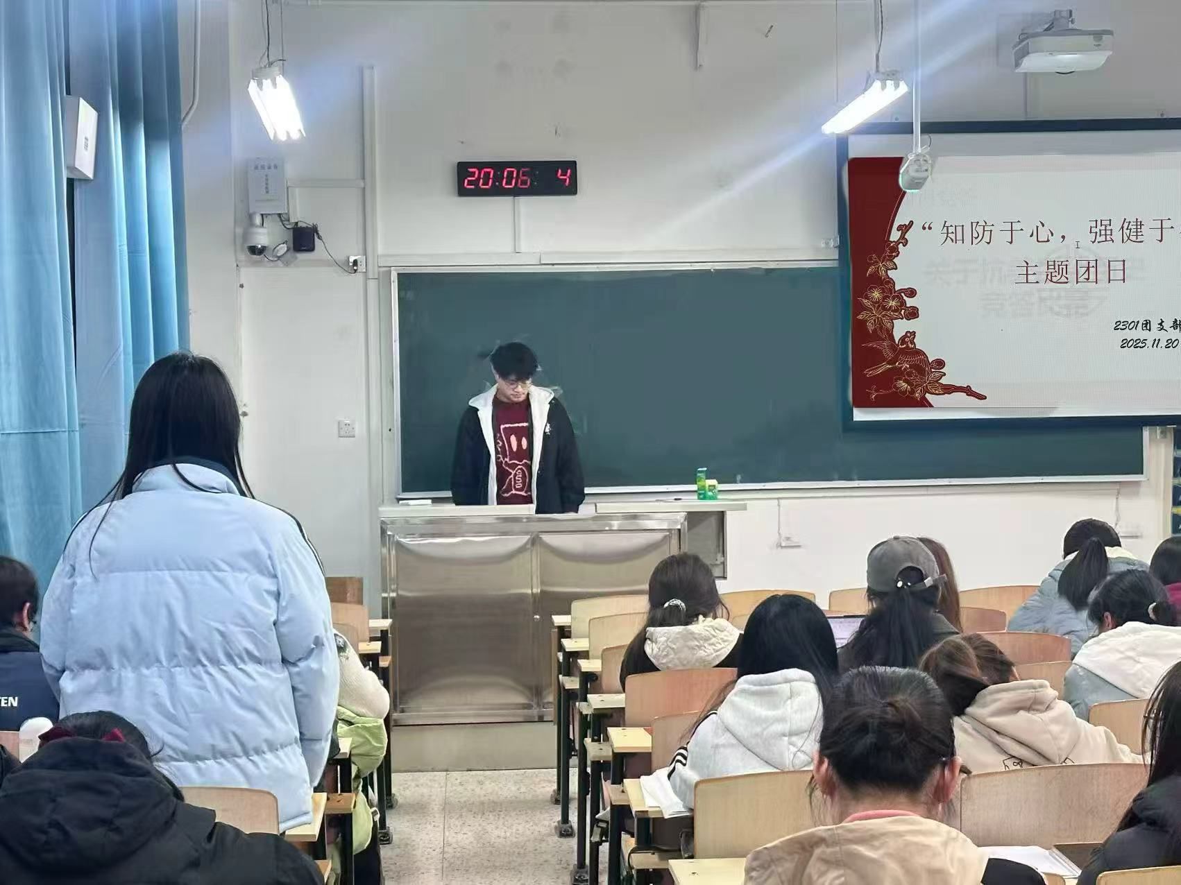 活动中,同学们分享了日常防护小妙招、科学作息安排和健康饮食心得,从“勤通风、常消毒”的细节防控,到“三餐规律、营养均衡”的生活准则,在交流中凝聚起健康共识。随后,各团支书介绍了“七步洗手法”,并演示正确佩戴口罩的方法和咳嗽礼仪要点,在实操中逐步掌握了规范的防护技能。为进一步深化大家对健康防护知识的理解,各团支部还围绕常见传染病常识、防护技能与应急处理等内容,组织开展了健康知识竞赛,有效推动了科学防护理念内化于心、外化于行。