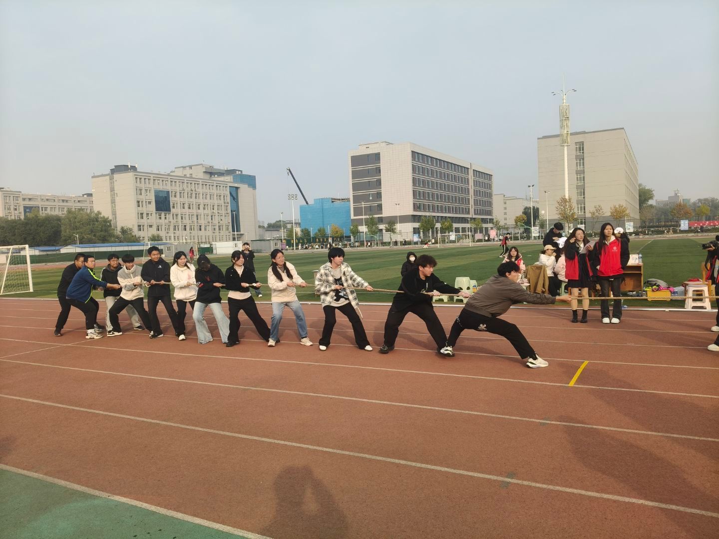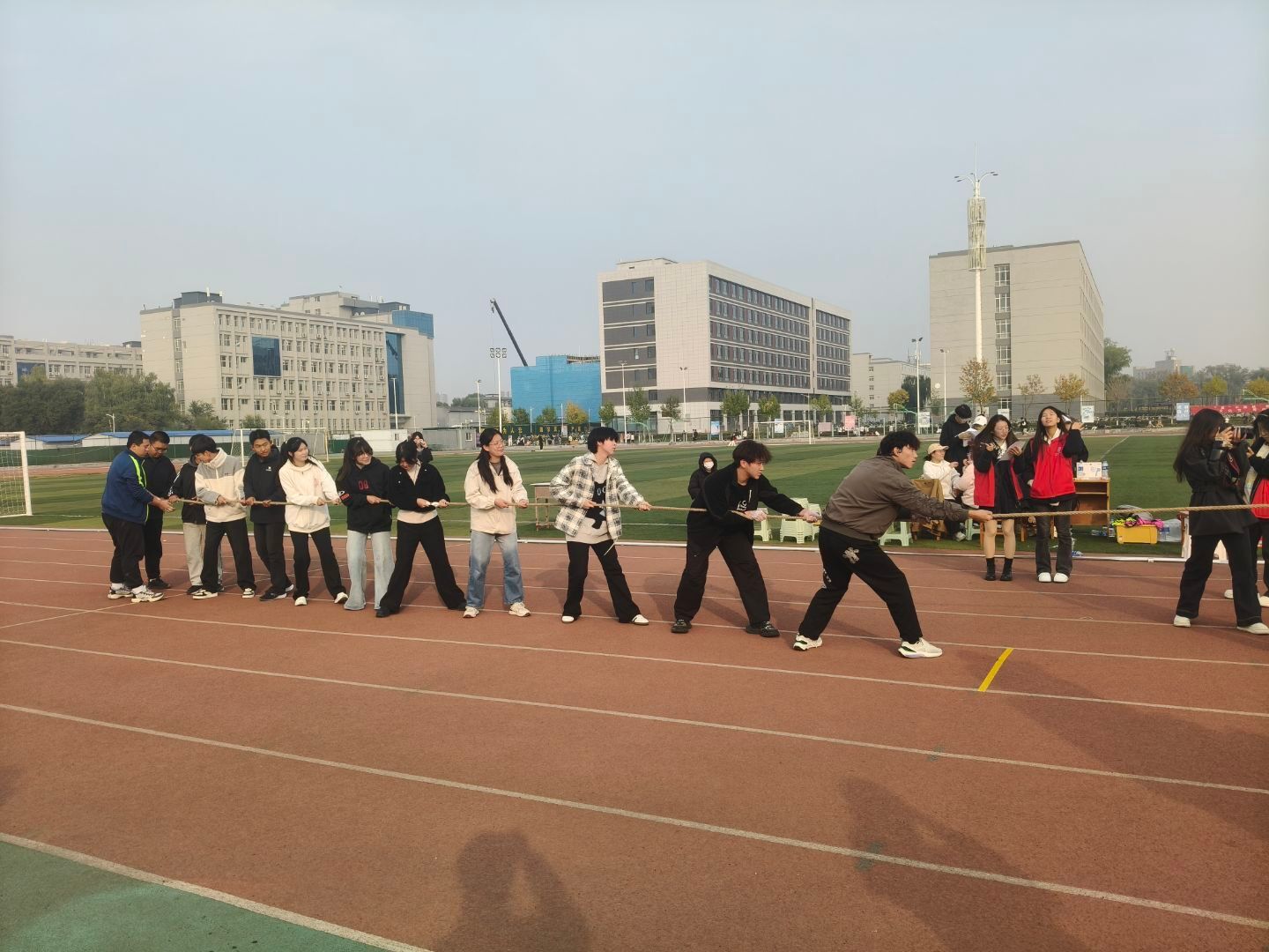 拔河比赛场上的较量同样精彩纷呈。32进16比赛中,随着裁判哨响,我院队员们紧握麻绳、重心下沉、身体后倾,伴随着整齐有力的口号,连续发力,最终以2:0的比分强势晋级。随后,16进8比赛对阵外国语学院,双方势均力敌,绳标在中线附近来回移动,队员们咬紧牙关、全力以赴。他们以昂扬的姿态,共同绘成了赛场上最动人的青春画卷。