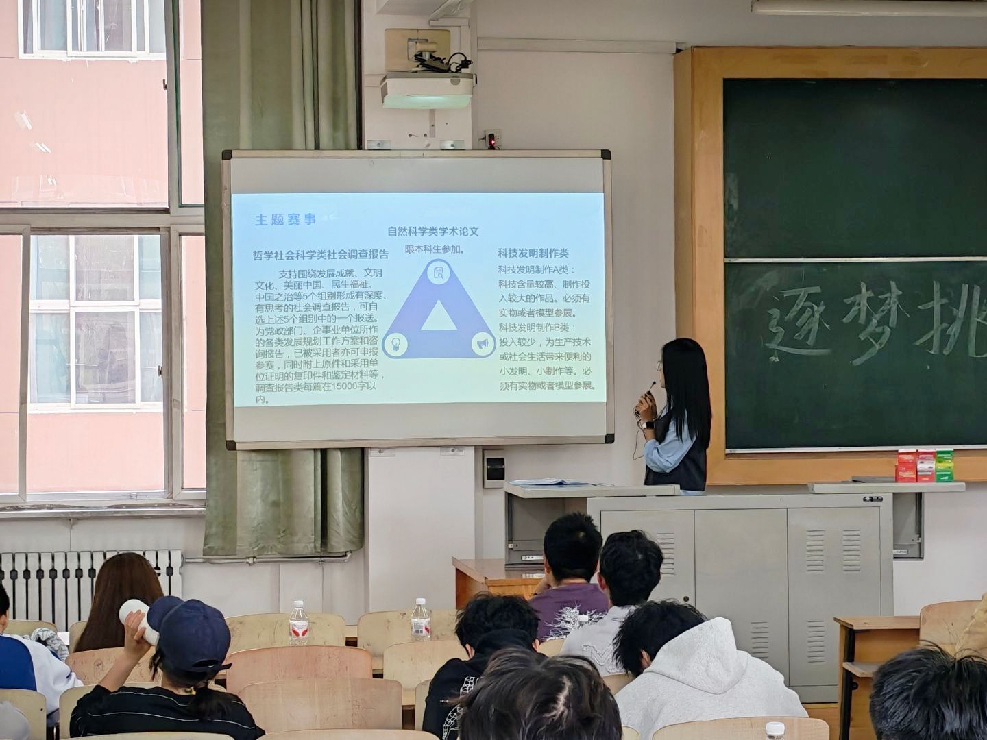 随后,学创部志愿者李欣垚详细解读了“大挑”与“小挑”的区别,重点说明了自然科学类学术论文、哲学社会科学类调查报告、科技发明制作三类作品的参赛要求与评审标准,建议大家关注国家战略与社会需求,选择既有创新性又具实用价值的课题。另外,她还简要介绍了红色专项等特色活动及赛事流程,希望同学们尽早组队,主动联系导师,为参赛做好充分准备。