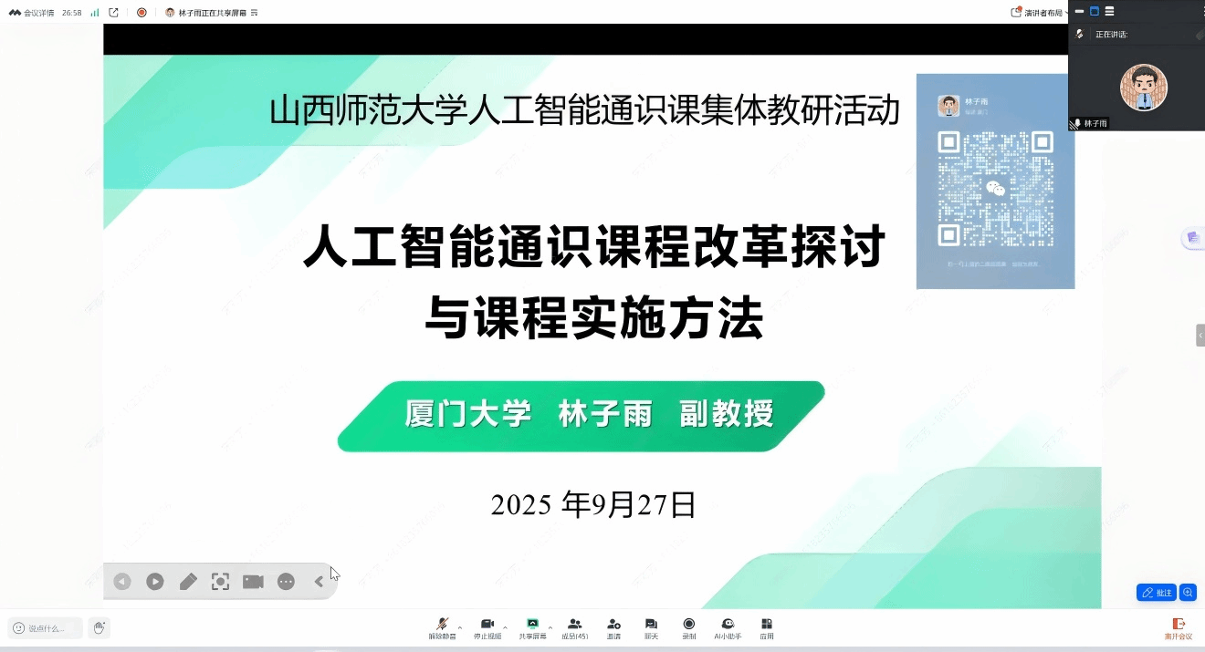2025年9月27日下午,我院组织召开了《人工智能通识教程》线上教学研讨会议。会议通过腾讯会议线上举行,吸引了来自省内多所高校的教师参与,参会人数达百余人。