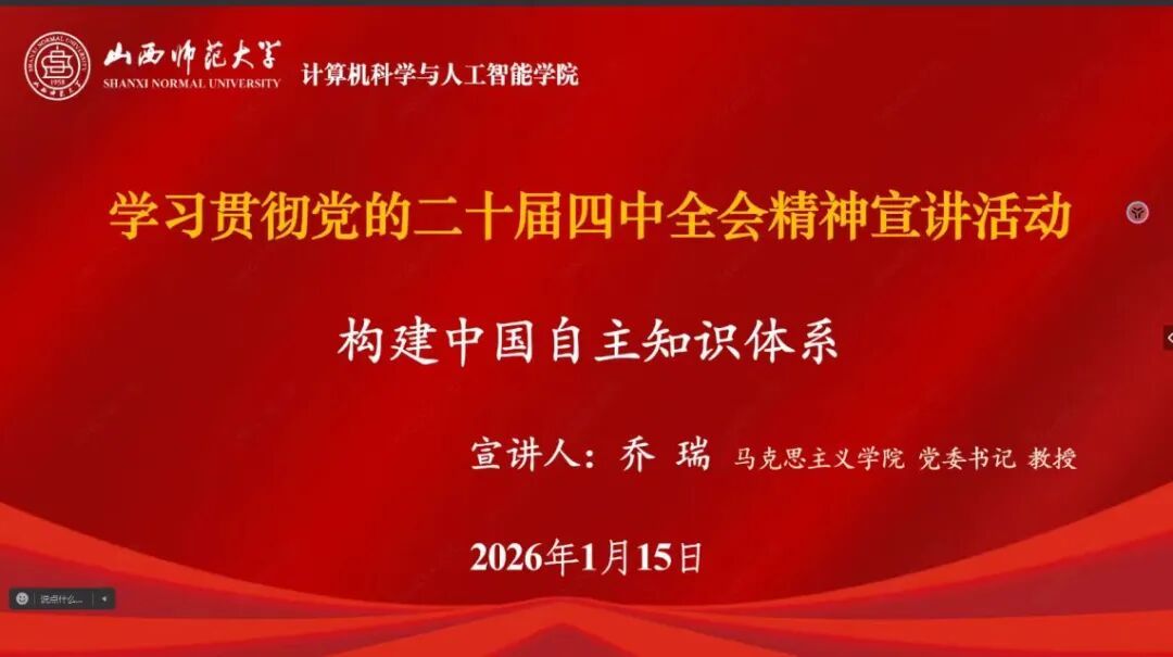 宣讲中,乔瑞书记从三个方面系统阐释了构建中国自主知识体系的内涵:一是立足时代方位,加快构建与综合国力相匹配的自主知识体系;二是明确前进方向,破除“现代化即西方化”的思维定式,扎根中国实践、传承中华文化;三是把握科学方法,坚持守正创新,以马克思主义指导文理交叉融合,特别是主动回应人工智能等新技术革命带来的挑战与机遇,坚定不移走中国特色自主知识体系构建之路。
